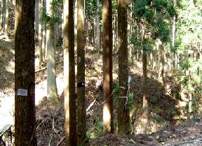 祖父谷峠に向う道の苗木も大きく育ち,しっかりしていた道が狭く感じる。この辺りから見る北山の山景は気に入っていたが,辺りの伐採跡が大きく広がり雰囲気が変わってしまった。祖父谷峠手前で先程の男性が昼食中だった。挨拶をして祖父谷峠へ。尾根道に上がり最初の鉄塔から振り返ると荒れた祖父谷峠が見える,そして昼食を終えた男性が祖父谷林道へ下っていくところが見える。城丹国境尾根を北東に石仏峠へ向う。桟敷ヶ岳を南から見る。大きなアップダウンもなく快調に数箇所の送電鉄塔を仰ぎながら小一時間で石仏峠に到着。 石仏峠からさらに尾根道を進み,地図にある途中の谷を下るつもりで歩く。この尾根道も新たな林道に下りてしまう,思っていた谷への道が見当たらず諦めて元の林道へ下る。結局,魚谷の林道を魚谷峠目指し南下する。この林道はスギ植林が続き,目立った野草もない。この時期タラの芽が多いはずが,どの木も勢いがなく芽もない,それともすでに収穫済みか?