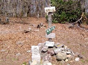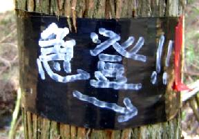 緩やかな坂から急坂になると,久しぶりの山のせいか息がすぐに上がる。前回登った南側の急登取付,その林道対面の東側のスギ伐採跡地には苗木が植えてある。さらに林道を登っていくと狼峠取り付き,ここは相変わらず荒れた状態のままだ。ここから少し歩いた先に今日登っていく直登道取付がある。標識にテープ等たくさん表示するものがあるのですぐわかる。 林道を下りて沢を渡り,南西方向の谷に入って行く。踏み後は薄いがテープが多数ある。谷はスギ林になっており何回か渡渉する,尾根道を登っていくものと思っていたが,谷を詰めて登っていく。しばらくして谷筋を離れ急登道が始まった。九十九折道でなく一気に登る山道でしんどい。しかし高度を大きく稼ぐ,何度も休息を取りながら登る。谷上流のスギ林を抜けて雑木林になると山頂も近い,山頂手前の急斜面を両手も使い登りきると山頂の標識が目に入った。本当の直登道である。