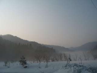 坊村から府道を久多に向かい、途中から古屋梅ノ木線に入りますが、朽木渓流釣りセンター辺りから除雪された雪が道路の両サイドに極端に多くなってきます。この様子では山はまだ相当残っているのかなあーいややなーやっぱりポンポン山にしといたらよかったかなあー、そやけど天気はエエシ、春の訪れが感じられる山里の早朝の雰囲気、ええなあーと車を止めて写真などパチリと余裕のオヤジ。