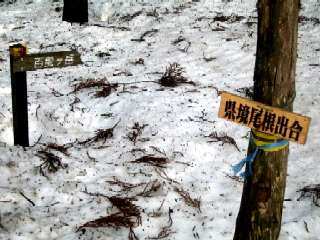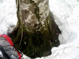 ちょっと下りたところの大木の根元に風を避けて食事です。おにぎりタイムを済ませ県境尾根の分岐で根来坂峠に向かうか迷ったのですが、時間が読めないので折り返しのコースで降りる事に。結局3時間ほど掛かってしまいましたので、正解かも。下りるのに時間が掛かったのは、落とし穴に2度落ち込み脱出するのに相当時間が掛かりました。一度は斜面だったので身体が下向いてしまいヤバカッタです。せっかく直りかけていた落雪後遺症の50肩(誰が50やね)又ちょっとブリ返しました。