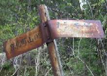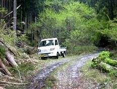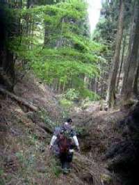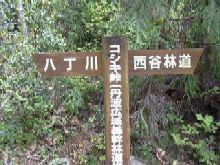 当日、小てつさんの愛車『周山街道の白い稲妻号』(って、いつ名前がついたんやろ)に同乗し、一路京北町小塩を目指す。西谷林道をごとごと揺られながら、どんどん山奥へ入る。やわな乗用車じゃ傷が心配になりそうな道だけど、働く車 軽トラは力強く進む。林道分岐には、古く錆びの浮き出た標識が必ずある。うむむ この標識、八丁林道で見かけたものと同じ作りだ。ということは、八丁大道の取り付きはやっぱりあそこか・・思わぬ発見に、一人喜ぶわたし。 林道の両脇の斜面に、倒木がたくさん転がっている。今年の雪で一斉に倒れた杉だ。道路をふさいでいたので、Oさんがチェンソー持参で、邪魔な丸太を切って始末してくれたとか。そんなある日、街中では、Oさんに連絡がつかない・・と知人たちがちょっとした騒ぎになっていたら、ひょっこりOさん現れた。やれやれ、元気だったか。でも、その話が恐ろしい。衣懸谷で丸太を切っていたら、ごろごろごろと太いのが転がってきて足がはさまってしまった。2時間かけてなんとか地面を掘って、足を抜き脱出したけど・・というので、みんな仰天した。ここらの新しい切り口の丸太はみな、そんなこんなの曰くつきだ。「足の骨は大丈夫やったんですか」「そんなもん 折れたりしません」と涼しい顔のOさんだが、気をつけてくださいよと祈らずにはいられない。