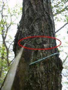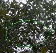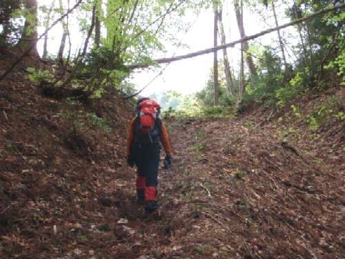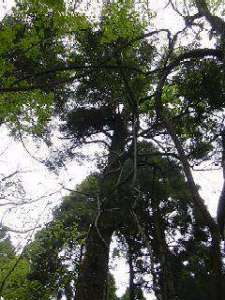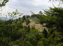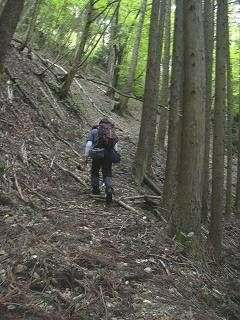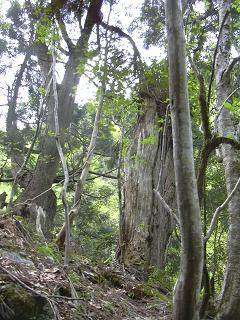 ズエという奇妙な標識、コシキ峠から時折ぴらぴらぶら下がっていたピンクのテープが、急に増え、立ち木がテープで囲ってある。『資源の森モニタリング』の標識。植生観察をしているらしい。時折開けた場所から眺める南側に、遠く連なる峰峰。特徴ある姿から城丹尾根の天童山や飯森山だろう。「あそこが大伐採地や」 城丹尾根をよく歩く小てつさんには、場所が分かるらしい。 「あれはなんだあ」突然小てつさんが叫んだ。「鳥の巣かなあ」見上げる大木の上の方に、なにやら巣のような工作物がある。しげしげと観察すると、幹から枝先にわたって枯れ枝を幾層にも重ねてある。巣にしては大きすぎる。「熊棚か?」と小てつさん。「そうや、きっとそうや」っていうことは、熊がいるのね? 会いたいなあ、熊さん。しかし、熊の大きなため糞は見かけなかった。寝床の近くにはしないんじゃないかなあ?と小てつさん。まっすぐ伸びた頑丈そうな幹には、うまいこと蔓がからみ、足がかりの小枝があり。すごいなあ 初めてみたなあ と、はしゃぐ二人。「今年は熊の話ちっとも聞かないよね。少なくなったんやろうね。」「この寝床は現役なんやろうか」でも、近くには熊の気配も鹿の気配もありません。まあ わたしたちが気づく前に、彼らのほうがさっさと逃げてしまうでしょうが。