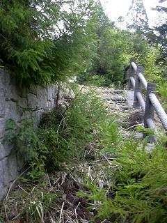10時35分 いよいよ待望の越木峠を目指す。広域林道が出来るまではファンが多かったと聞くが、いまや『哀れなコシキに行きたくもない』の峠はどんなとこ?沢の水が流れる岩は、黒朱灰などの色が段だら模様に重なったきれいなものだ。鉱石好きな友人が見たら、喜んで、名前も教えてくれるやろうなあ。細い谷間をジグザグに登っていく。ところどころに新しい砂利が山となり、あきらかにこの谷の石ではない。きっと林道造成中に上から放ったんやろなあ。 沢を離れるとすぐに歩きやすい道になり、頭上に林道の石組みが見えてきた。リボンにつられて林道によじ登りそうになるが、そのまま道なりに草むらを分けると、目の前に立派な階段がありました。何かと意見の分かれる広域林道。無理やり削った山の斜面は、すぐに崩れそう。補修 補修でたいへんやろうなあ。広域林道から数歩、坂を上ったところがコシキ峠です。ここがかの『コシキ峠』か。やっと来ることができましたよ。思っていたよりも眺望があり、明るい景色に囲まれた峠です。