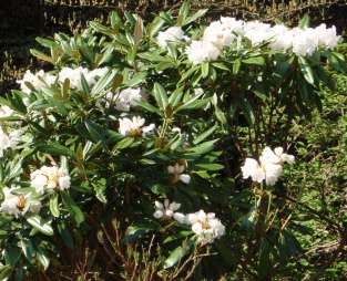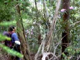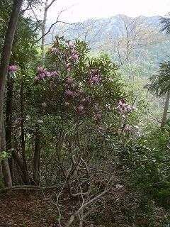 取り付いた尾根は、こちらも薄い踏み跡があるが、相変わらず緑のカーテンである。先頭行く小てつさん、「あかんわ ガセネタや どうしましょうねえ」と諦めムードだけど、「かのOさんが言うのだからきっとシャクナゲはある。しかも諦めて引き返したら、あとでなに言われるかわからんし、もちょっと探そう」と励ますわたし。つかれてとぼとぼ歩いていると、小さなピークを越えたこところで、「あった!!すごい」と歓喜の声が聞こえた。急いで見に行くと、丁度8分咲きのシャクナゲがびっしりと斜面一面にある。「やっぱりあったんや、Oさん嘘つかない。」と、一転Oさんを褒め称える二人だった。 しゃくなげの群落を確認したら、次は1本しかないという『白花シャクナゲ』を探そう。これもOさんが「庄兵衛さんのご主人と偶然に白い花をみつけましてな、挿し木にして増やしたのを周山の料亭が欲しがってあげたのが、またあちこちに増えていって、ぐるりと回って ほれ 庄兵衛さんの庭で咲いている白花シャクナゲですわ」(とのことだったが、庄兵衛さんによると、このしゃくなげが親株ではないそうだ)という曰くつき。 ほんまにあるやろか? いや是非とも見つけねば! 目を皿にしてしゃくなげの木を一本一本確かめていると、あったぁ! 頭上に白い花が咲いていました。一本見つけると、その周囲に数本の白色の木が固まっています。真っ白なの、花びらの先がピンクのもの、すこしグラデーションになっているもの、種の混合があるのでしょうか。白花も見つかり、これで心おきなく石楠花の観賞に浸れます。薄いピンクや濃い緋色に近い花、さまざまな花色が次々に目に入るので、どんどん追いかけていくと、いつの間にか谷底に下りていました。沢沿いに、東斜面の花を見上げながら下流へ歩きます。
