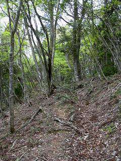 砥山の標識を見てすぐに、緩い登りになり、上がりきったところが、三等三角点の「シライシ」山頂でした。木立に囲まれて見晴らしはありません。山頂広場の周囲には、たくさんの山名板がぶらさがっている。1枚の木札は立派なのだが、立ち木に太い針金で縛りつけてあるので、幹に針金がくいこんでいる。可哀相に思った誰かが、針金を緩めてくれたようだが、いづれまた針金が食い込み樹皮が巻き込んでしまうかも。悪いけれで、この木札は針金を切り、木の根元に置かさせてもらった。よく見かける木札なのですが、最近あちこちではずしてある。作者には、考慮をお願いしたいものです。 麓の村から十二時のサイレンが響く。わたしたちも、ここで昼食にする。寒くもなく暑くもなく、爽やかな風が時折吹き抜ける山頂で、のんびりと休息した。 12時半、いよいよ出立。Oさんが書いてくれた尾根図としゃくなげの場所、略図なのでいったいどの尾根にあるのか?シライシから派生する一番長い尾根をまずは目指す。尾根道を西へ、すぐの小ピークから方向を見定めるがよくわからないので、とりあえず北方向に支尾根に足を踏み入れた。雑木の尾根はわずかに踏み跡もあり、藪をかき分けるまでもない。しかし、あたりは花の匂いもなく、ピンクの固まりもなく、緑一色に染まっている。 しゃくなげの群落は、最初にみたきりでその後一切お目にかかっていない。「ほんまにあるんやろうか?」「昔の話で、もう消滅したんと違うやろうか」「しかし、緑色しか見えんなあ」単眼鏡で探す小てつさんの目にも入らない。次第にいらいらして、疑心暗鬼の二人。このところOさんにほいほいだまされていることが多いので、「ほんまかいなあ」と疑り深くなっているのである。 尾根の3分の1くらいは進んだが、まったくしゃくなげの気配なく、周囲の尾根にもピンク色が見えない。このまま進むと尾根の先端が崖のようでたいへんだし、Oさんの略図には他の尾根にもある とあるので、斜面を下って東の尾根にとりつくことにした。急斜面を幹にぶら下がりながら源頭部に下り、また登り返した。つかまる木の根が多いので、腕力勝負でよじ登る。
