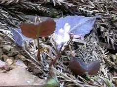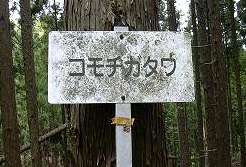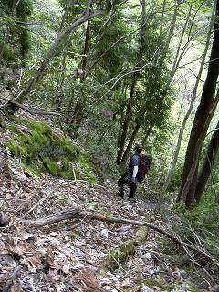 峠から藪を分けて尾根に乗る。すぐに、よく歩きこまれた古道が現れ、尾根の真下を巻きながらずんずん進む。時折視野に入る赤茶けた林道が目障りなものの、明るい雑木林の山中は静かで、かすかに飛行機の音が響くだけ。北側の谷にしゃくなげがないかなあ と、小てつさんが小ピークの上に偵察に行くと、「イコモチさーん」と呼び声が。どれどれ・・ピークに登ると、ピンクの花が咲きほころびています。1本みつけると、あそこにも ここにも ほれそこにも・・と、北側の斜面一帯に群生しているようす。これは期待が持てそうやねえ と、これからの眺めを想像してわくわくする二人。 尾根道にとって返し、ずんずん歩く。白い標識が倒れているので起こしてみる。『コモチガタワ』いったいこれは地名なのだろうか?立て主の名前もなく、頭をひねる二人。足元には小さなスミレがちょこちょこと咲いている。タチツボスミレはなんとか分かるけど、この葉の色が紫色のは何だろう? スミレは北陸型とかいろいろあって同定が難しいから・・と、二人でぶつぶつ言いながらも、次々に見かけるスミレが気になる。
