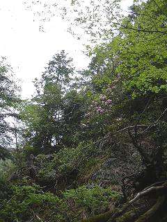 すごい すごい この尾根はシャクナゲの森。天ヶ岳のシャクナゲ尾根も比良のシャクナゲも目じゃない。谷には甘い花の香りと若葉の香りが混ざりあい、なんとも言えない爽やかな空気が漂う。「ここは最高や」と叫びながら歩いていると、前方が怪しい。「滝やで 落ち込んでいるもん」小てつさんが偵察に行き、「滝ですわ、ちょっと下れんなあ」が、みあげる滝の両崖には、それはそれは鮮やかなピンク色の花をまとった木があり、岩場と花が素晴らしい景色なので、しばらく見とれてしまいました。ほどよい湿気がよいのか、花も葉もしっとり。 さてと、ここから脱出を考えねば。東の尾根に登り返して、等高線が緩い向こう側へ乗り越すことにしよう。木の根をつかんで、岩場をよじ登る。しゃくなげの根が絡み合って登りやすいのだけれど、なぜか足元がふわふわと落ち着かない。見ると、岩の上に根がはびこって絡み合っているだけで、根が剥がれたらそのまま崩落という状態。比良ワンゲル道の木の根道のような具合なのです。ここで落ちたら一貫の終わりなので、慎重に体重を預ける幹を確かめながら、やっと尾根の先端についた。 ここがまた、しゃくなげの巣。藪状態で、枝の下を這いくぐる。少々枝がぽきぽきしようが、かまってられません。先頭を行く小てつさんが、緩い斜面を探しながら少しづつ高度を下げている。「あーっ!!」叫び声に「どうしたん?」叫び返すと、「違う花がありました。なんかほっとするわあ」見下ろす斜面に、真っ白な花をつけた山桜が1本。「ほんま 山桜 いいなあ。」山桜の木を見に行こうとするが、傾斜がまたさらに急になるような。で、南へトラバースしながら 足元の沢に下ることにする。が、最後は急斜面で木も少ないので、小てつさんが細引きを幹にまわし、たぐりながら2回、そうやってやっと沢に降り立った。すぐそこに、林道が見えている。車で来た人が歩いていて、わたしたちを見つけたらしく驚いている。小さな滑滝の続く沢沿いに下り、林道に出たときは、正直ほっとした。
