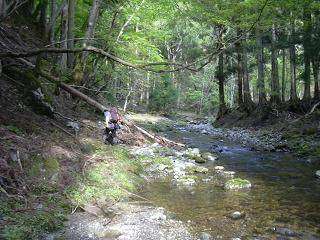 地形図で等高線の混んでいない斜面を選んで下ったつもりだけれど、実際はなかなか予想できません。八丁川沿いの岩の下で、お茶にした。熱いコーヒーと甘い菓子が、身体を蘇らせてくれた。「すごいしゃくなげの量やった。ほんまに来てよかった。けど もう今年はしゃくなげ見なくてもいいわ」と話しながら、くつろいでいると、さっきの人たちが車で引き返していった。呆れた顔してこっちを眺めていた。わたしも反対の立場やったら、同じように 物好きな人たちやなあ と眺めることだろう。 尾根の中腹に白いものが見える。さっき見つけた山桜だ。そして、がーん ななんと林道から緩く登る斜面が、桜の木の方向へ伸びていた。踏み跡もあった。もちょっと我慢すれば、ロープなしで下れたのだ。「来年はここから登ろうね」とはやばやと約束した二人です。 浅瀬の続く八丁川を渡渉を繰り返しながら、越木峠の分岐についた。倒木で少し荒れてはいるものの、深く掘れた古道はゆったりと登れた。尾根から谷へと越木峠を周回できて、感無量だった。北山の他の地域とはまた違う、清清しい山でした。問題の広域林道は、わたしたちが歩いている間、車もバイクもまったく音が聞こえず、ほっとした。八丁川沿いに林道を遡ると、若葉に覆われた山が美しい。せせらぎにピンクの花が差し掛かり、ほんまは感動の風景なのだけれど、「悪いけど、もうしゃくなげはいいわ」それほどしゃくなげに頭のてっぺんから足先までどっぷりつかった、贅沢な山行でした。 地図読みしながらのルート探しは、楽しいでした。が、地形図では表せない崖や斜面、こぶなどを読み取り、すばやく判断しながら歩く難しさをも味わった山行でした。そして、単独ではとても歩けなかったコースでもあります。 Oさん、とっておきの場所を教えてくださって、ありがとうございました。小てつさん いろんな発見をした山旅に誘ってくれて、ほんまありがとうございました。来年は、楽(そうに見えた)コースからまた行きましょね。 【記: Ikomochi】