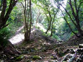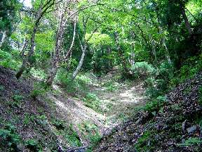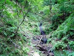奥の二股からは,左の谷に入りそのまま尾根稜線に乗る予定である。細くなった谷であるが再び3mナメ滝の2段が現れる,その上倒木もあり迂回しながらの遡行である。その先緩やかにとなったものの,次が3m,2mと現れるナメ滝は急峻すぎていずれも無理。高巻いて越していくと,ようやく谷の源流部に着いた。薄いが沢が分岐している。はじめに沢の間,中央斜面を登ってから左の沢に降りていく。完全に水も涸れている。上方の目標を定めて登りだすが,急斜面なため足場も悪く息はすぐ切れる,それでも木の根っ子を掴んでよじ登るが時間が立つが思ったほど高度が稼げない。一息入れて再スタート,直登を諦め左手の尾根に方向を取り直す。結局,源流部から稜線に上がるまで30分ようやく稜線に上がった。