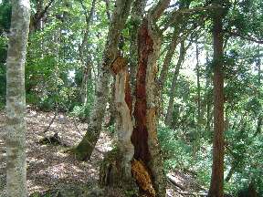 到達地点は思った所に近かったが,本来の山道のある稜線へは小高い丘を通り抜けてようやく出ることができました。そこには一本から3本に分岐したスギがありました。天狗峠には北へ進みます。この稜線は2度目であるため,なんとなく覚えのあるルートです。そして今月2回目の天狗峠に到着しました。今日も誰にも会いません。枯れ大木の山頂と別に南側にある山頂のスギの木に掛けてあった標識が見当たりません。天狗峠では,次々と山頂標識がなくなっています。残るは小さな標識1枚のみです。静かな山頂の昼食後は,2週間前に歩いた西南尾根を下って行きます。