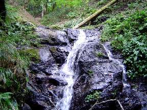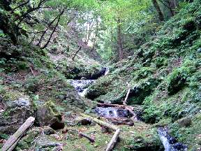 谷入口のナメ滝は右側から登る,続いて2〜4mの4段ナメ滝。緊張感が大きくなる。迂回しながら上流へ,次は緩やかなナメ滝の先に一本の大きなコナラでしょうか。先を進むと右手から細い急峻なナメ滝,前方は狭く傾斜もきつそう。枯れた大木が谷を塞げている,ここは左岸をよじ登り迂回する。5mのナメ滝に当たる。見渡しても迂回できそうに無く,滝の横から草の生えている岩場を位置取りし上がっていく。直登は足元悪く無理なため横移動から足場確保し上流へ上る。ほっとする間もなく細い谷に2〜3mの連続ナメ滝,ここも右手は急峻な岩場,左手より大きく迂回,高巻きして連続ナメ滝をやり過ごす。次は6mナメ滝,小さいが滝つぼもある。水深あって入り込めない,全く無理。一旦戻り右手を高巻くように進む。倒木がありこれを越すために更に上に登り越える,その先2本目の倒木が先を遮る。倒木を抱いて通過。ようやく最初の谷二股に到着。この間予定時間を大きく越している。