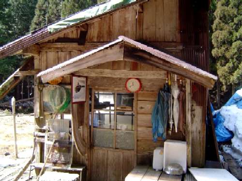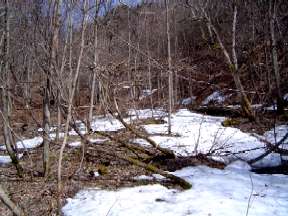 残念なことに今日は,村長もSさんも不在で誰もいません。雪は南側に少し残る程度でこの時期としては,いつも以上に少ないのではと思われます。12時前で予定どおりにここで昼食を摂ります。天気もよく暖かく気持ちよいのですが,昼食後は手持ちぶさたで体をほぐしたあと出発です。丁度単独男性が入れ替わりにやってきました。 三角小屋広場へ向うと,夫婦連れと小学生を含む7〜8人のファミリーがやってきました。挨拶をしてから四郎五郎峠と刑部谷分岐へ向います。川沿いのスギ植林地では残雪が多く,また倒木も多くこの冬の厳しさを知らせています。分岐から四郎五郎峠へは川を何度も渡渉し取り付を目指します。この谷沿いも残雪は多くありますが,問題ありません。取り付きからは今日一番の長い急坂を登ります,その上倒木が多く道を塞ぎ更に時間が掛かります。四郎五郎峠に着くと汗が吹き出て一休み,持ってきた濡れタオルで顔を拭きすっきりとします。
