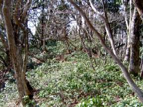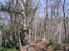 ダンノ峠から佐々里峠へ戻るため北斜面を直登し,尾根に取り付きます。穴のあいた大きなスギの木を見るとダンノ峠・オバナ谷分岐に着きます。北側に白いネットフェンスが張られ,このネットフェンス沿いに西へ向います。アップダウンを繰り返して急坂になる所では青色のネットフェンスに変わり一気に上り詰めると支尾根の分岐に着きます。一旦ダンノ峠・佐々里峠分岐まで行き,帰路はこの分岐から急坂を下り佐々里峠に戻ることにしました。この急坂は帰路に使うのが正解かも,但し余裕があれば。今日周回してきて感じることは,この佐々里峠への尾根道がよく歩かれ踏まれていることがよくわかります。 本当の春本番はこれからで春の花を見ることはありませんでしたが,木々の先はふくらんでおり一気に春をこれから楽しませてくれることでしょう。