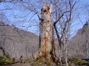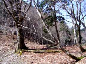 四郎五郎峠を下り峠谷に入ると,広い谷を占める木で独特の雰囲気があります。同志社大研修室小屋前のシンボル,モミの枯れ大木もまだ残っています。この谷沿いにも斜面には残雪が見られます。ダンノ峠への溝状の道は雪で一杯になっています。
