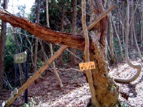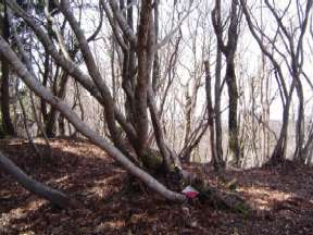 トラゴシ峠へはここから更に尾根を西へ向う,目の前の急坂を登り一段高い尾根道に着く。南側はヒノキ林になっている,尾根が細い分薄いが踏み跡もあり,またテープもあるため思ったよりルート的には楽である。P827手前のピークがトラゴシ峠の分岐になっている。よく見かけるKGCの標識が置かれている。北側は雑木で少し見通し悪いが,芦生の森が広く見て取れる。雑木の木が低ければよい眺めである。ここからは西のP827への道が続いている。
