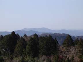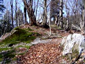 南西側を下って行く,品谷山への尾根道が始まる,すぐにP866を通り進行方向は西へ。この当たりは南側が開けており,天気も快晴,視界も最高で愛宕三山が良く見える。そして尾根上として珍しく岩にコケが張り付き庭石のような印象の残る場所を通る。北側の谷にシカが三頭見えたがすぐに姿を消した。細い尾根道が続き北側にはブナノ木峠が見える。少し広くなったピークから一旦下り,尾根で初めて残雪を踏む。広い尾根を進むとその先に品谷山頂に到着。真っ青な空に風も無く,鳥のさえずりだけ耳に入る。静寂の中に気を集中させる。小休止後,品谷峠目指し南側へ下る。下った鞍部には,ブナの大木が主のように構える。急坂を登り,さらにピークを一つ越した先の鞍部が品谷峠である。