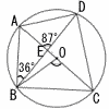 3 | 右の図で,4点A,B,C,Dは線分ACを直径とする円Oの周上の点である。また,線分ACと線分BDの交点をEとする。∠ABE= 36°,∠AED= 87°のとき∠BOCの大きさとして正しいものを,次のア~オの中から1つ選んで,その記号を書きなさい。 ア 78° イ 93° ウ 102° エ 108° オ 112° |