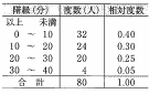| 2番問題 ~おまけ~ | 5 | 右の表は,A中学校のある学年の生徒80人を対象に通学時間を調査し,その結果を度数分布表に整理したものである。このとき,通学時間が10分以上20分未満の階級の累積相対度数を求めなさい。 |