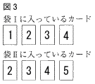 3 | 2つの袋Ⅰ,Ⅱがあり,袋Iには1,2,3,4の数字を1つずつ書いた4枚のカードが,袋Ⅱには2,3,4,5の数字を1つずつ書いた4枚のカードが入っている。図3は,袋Ⅰと袋Ⅱに入っているカードを示したものである。2つの袋Ⅰ,Ⅱから,それぞれ1枚のカードを取り出し,袋Ⅰから取り出したカードに書いてある数が十の位,袋Ⅱから取り出したカードに書いてある数がーの位となるように,カードを並べて2けたの整数をつくる。このときできる2けたの整数が素数になる確率を求めなさい。ただし,袋Ⅰからカードを取り出すとき,どのカードが取り出されることも同様に確からしいものとする。また,袋Ⅱについても同じように考えるものとする。 |